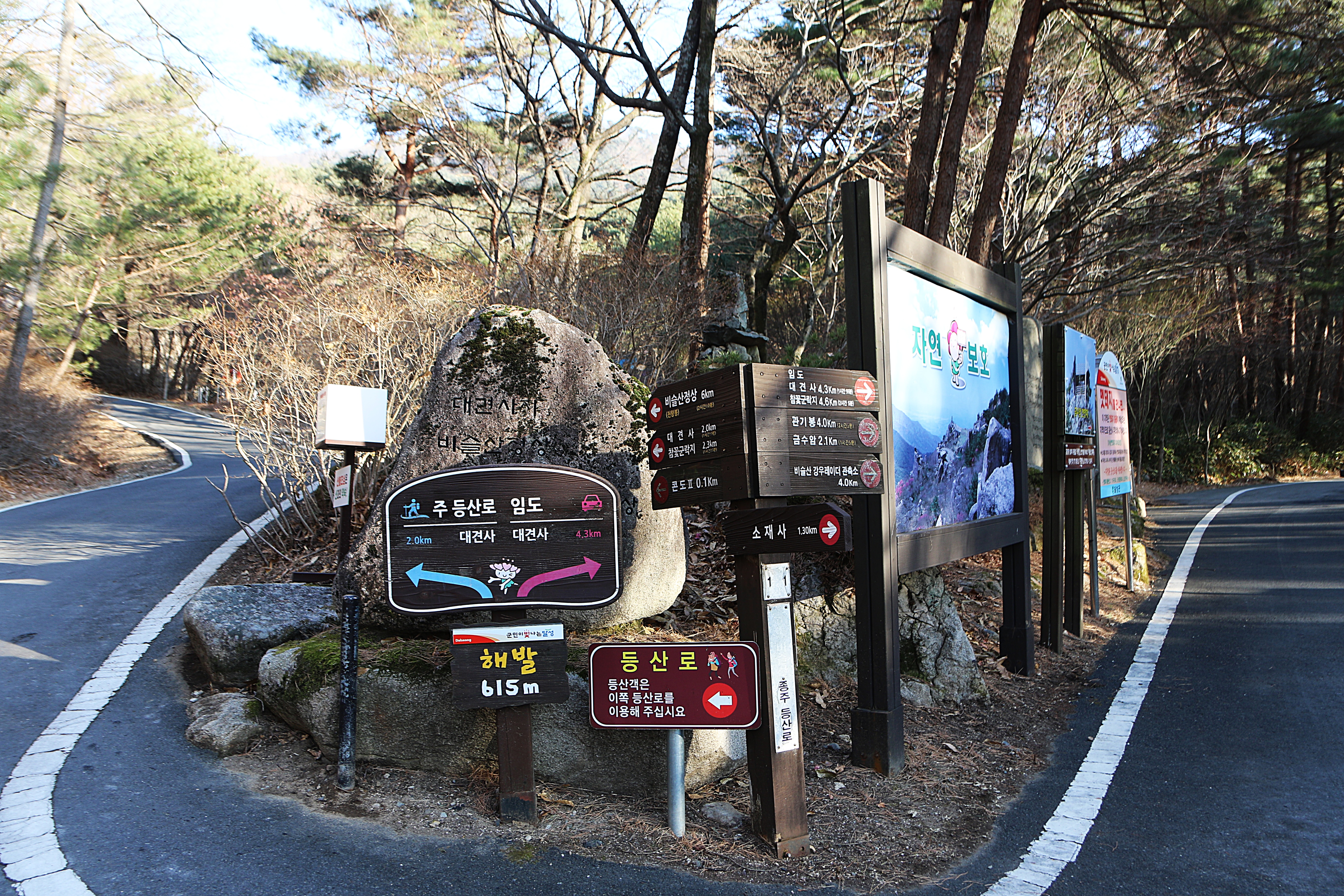 해발 615m, 주 등산로와 임도 갈림길